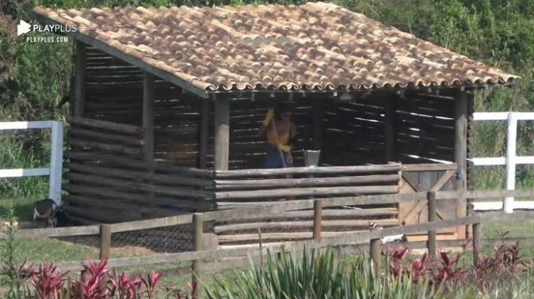 O dia amanheceu tranquilo na sede de A Fazenda 12 . Na área externa, a miss Jakelyne limpa o quartinho das cabras enquanto elas passeiam pela grama. Que folga! .